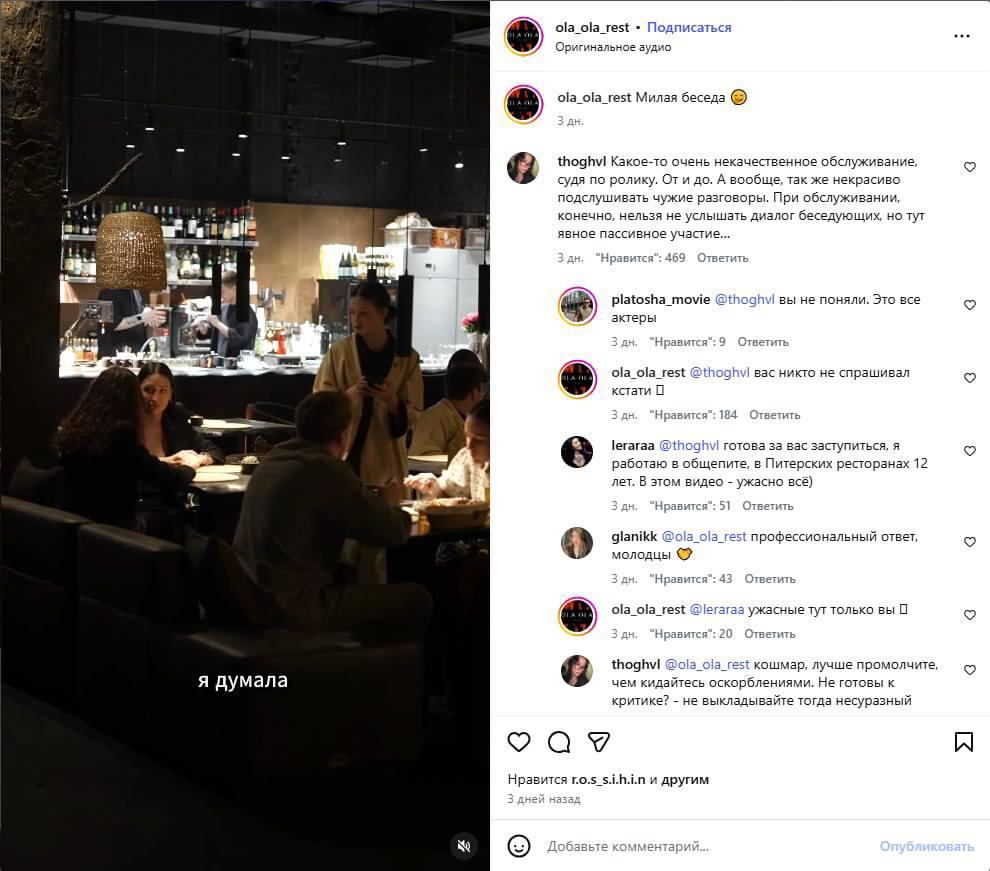 Одна из пользовательниц раскритиковала обслуживание, написав: «Какое-то очень некачественное обслуживание, да и некрасиво подслушивать чужие разговоры». Официальный аккаунт ресторана парировал: «Вас никто не спрашивал, кстати».