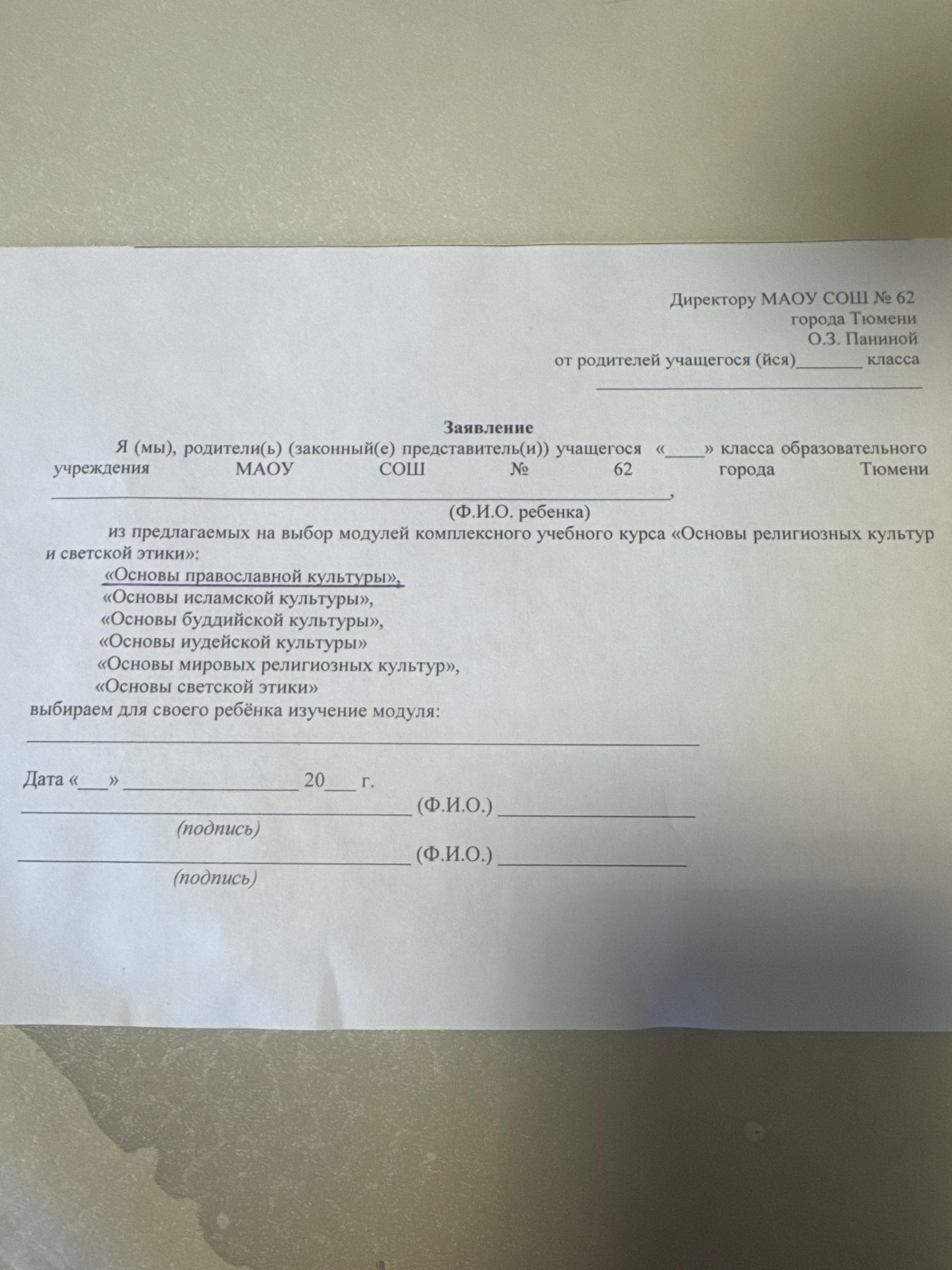 В тюменской школе родителям раздали анкеты, где модуль для изучения уже был выбран администрацией.