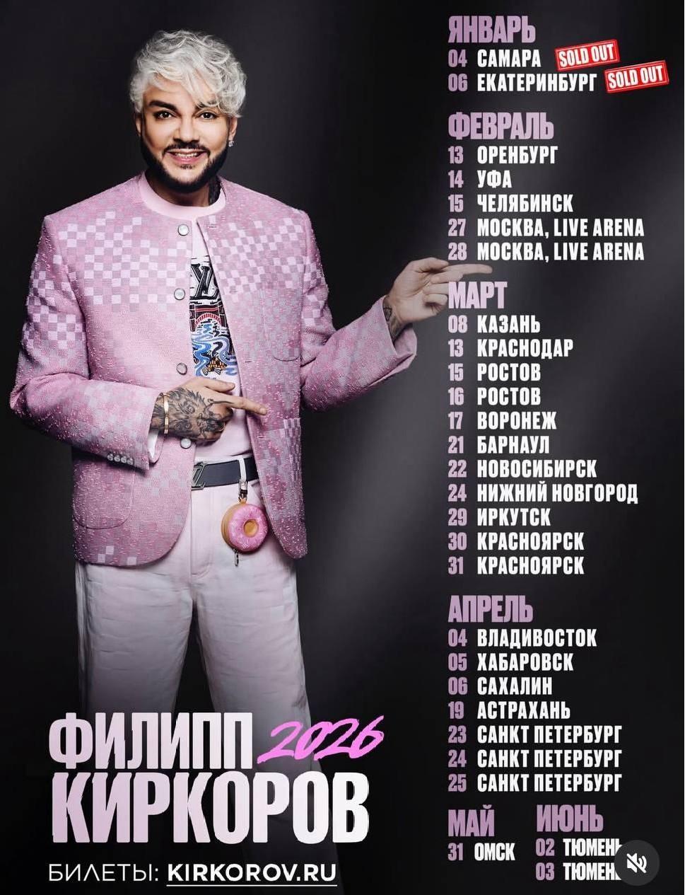 Филипп Киркоров (12+) объявил о масштабном гастрольном туре, который пройдет в 2026 году. В предварительном списке из более чем 20 городов значится и Тюмень, куда приедет один из ведущих артистов российской эстрады.