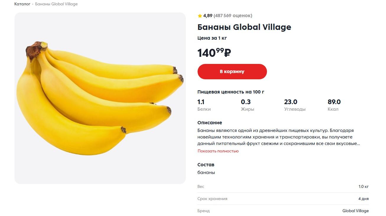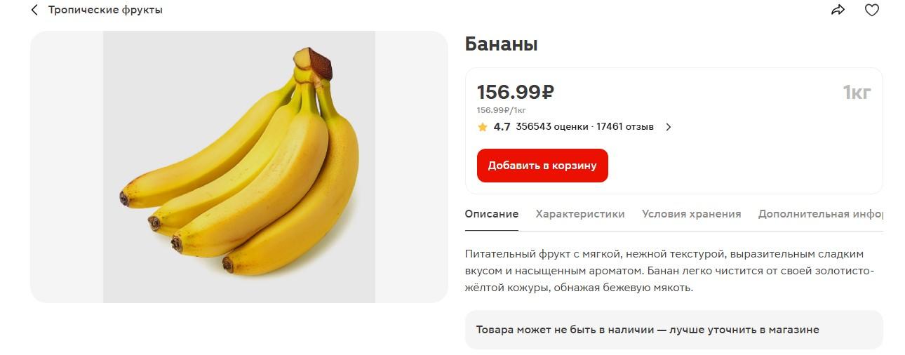 В «Пятерочке» стоимость бананов составляет 140,99 рубля за кг.