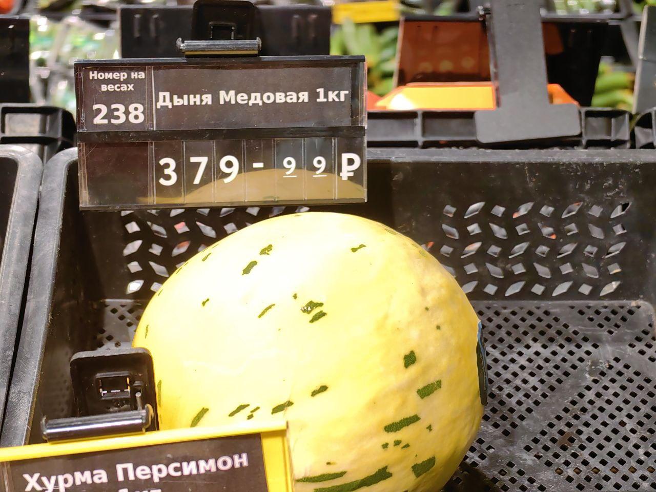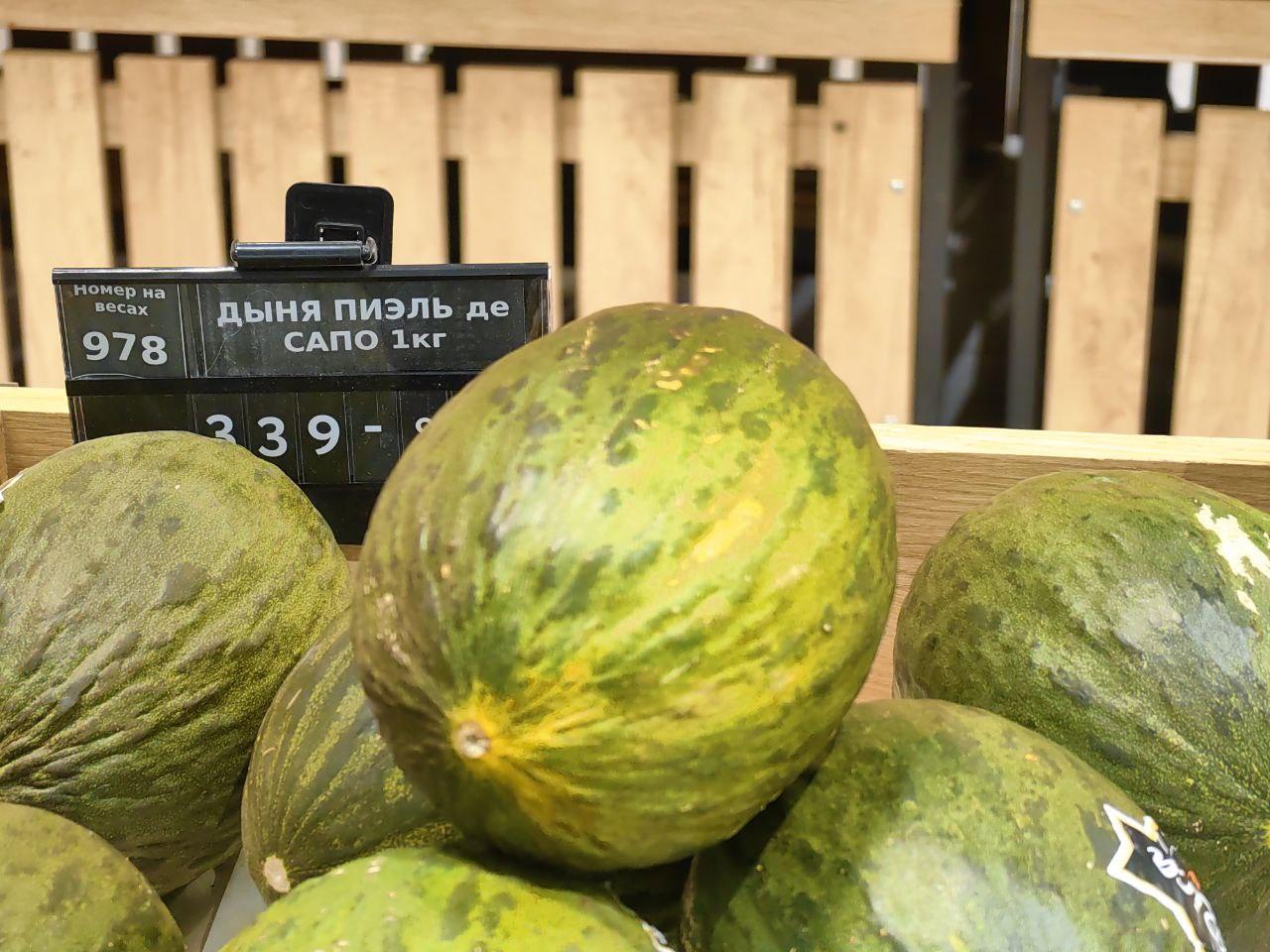 Рядом с арбузами на витринах разместились желтые дыни сорта Пьель де Сапо, который также известен как «жабья кожа» или «Санта Клаус». Этот испанский сорт отличается темно-зеленой пятнистой кожурой и сладкой белой мякотью. При правильном хранении дыни могут сохранять свежесть до полутора месяцев.