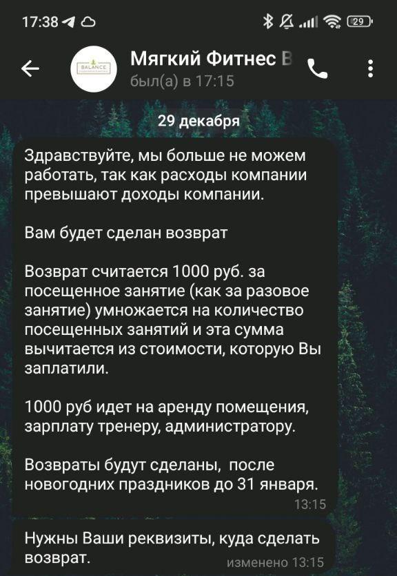 Официально о закрытии клуба объявили только в январе. Когда женщине наконец выдали договор, она обнаружила пункт о стоимости занятий в 1000 рублей каждое. Поскольку Виктория посетила 35 тренировок, по расчетам владелицы, она должна была заплатить 35 тысяч рублей, поэтому возврат средств не положен.