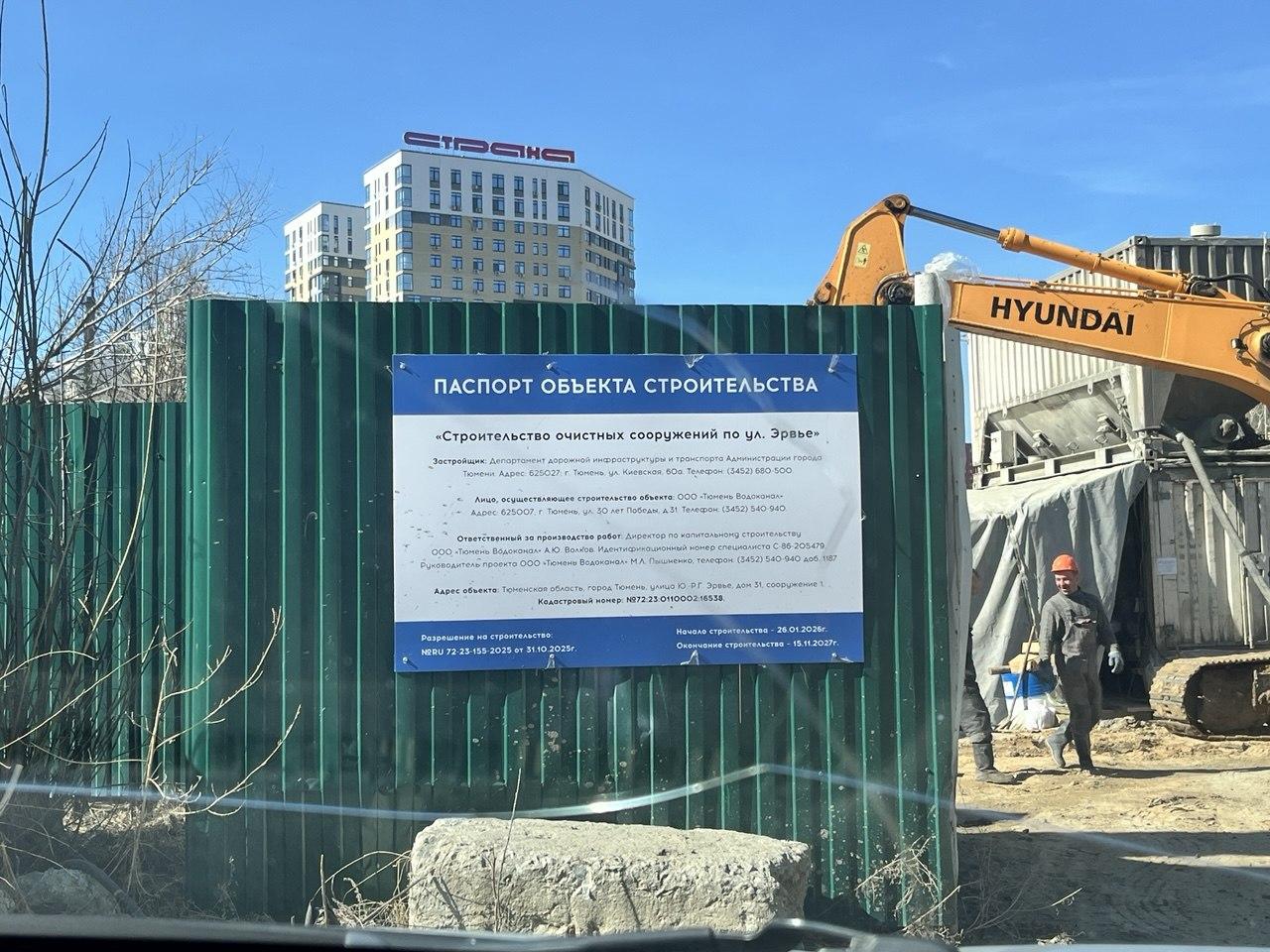 Проверка показала, что на этом месте строят не жильё, а очистные сооружения. Заказчиком выступает городской департамент дорожной инфраструктуры, а подрядчиком является ООО «Тюмень Водоканал», что указано в паспорте объекта.
