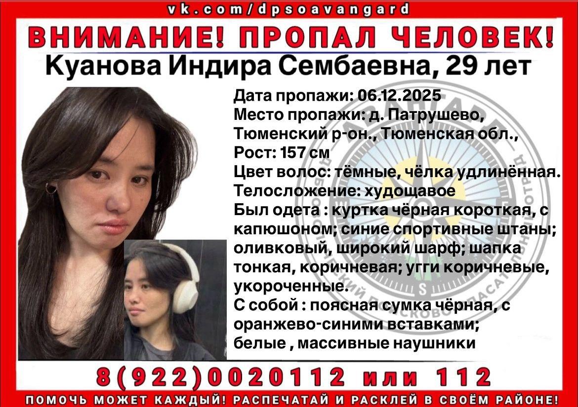 Индира Куанова, 29 лет, исчезла 6 декабря в деревне Патрушево Тюменского района. Последний раз родные слышали от нее в 10 утра, затем связь прервалась.