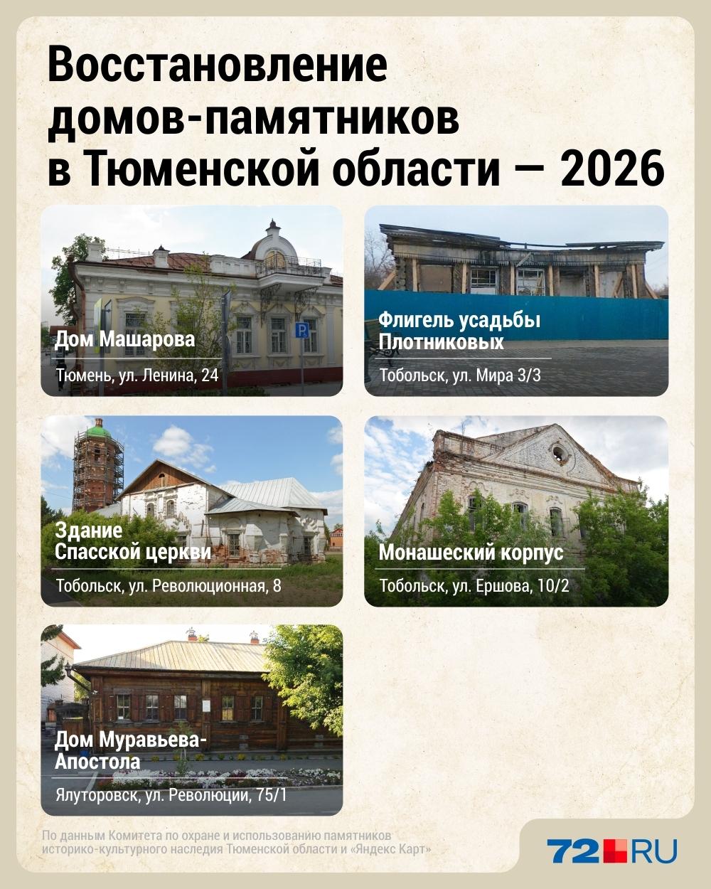 «В 2026 году в рамках госпрограммы Тюменской области «Сохранение и использование объектов культурного наследия» за счет средств областного бюджета предусмотрено выполнение проектных работ по пяти объектам культурного наследия — в Тюмени, Тобольске и Ялуторовске», — сообщила глава областного комитета по охране и использованию объектов историко-культурного наследия Анна Базилева.