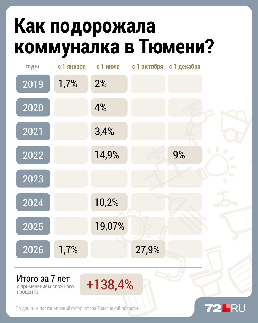 Суммарный рост тарифов в Тюмени с 2019 года, рассчитанный с применением сложного процента, составил 138,4%, что означает увеличение почти в 2,4 раза.