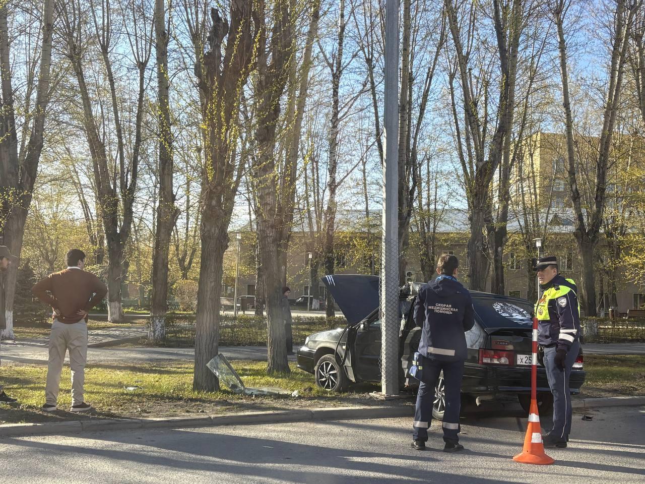 Утром 29 апреля на улице Максима Горького в Тюмени отечественный автомобиль врезался в столб. На месте работают полицейские и скорая помощь.