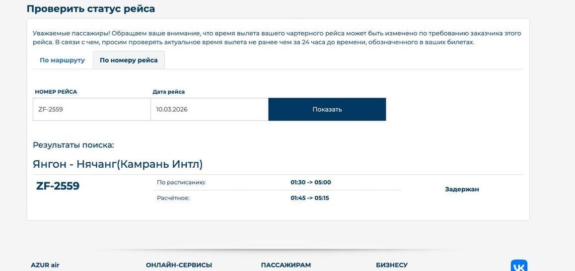 Резервный самолет авиакомпании Azur Air вылетел из московского аэропорта Внуково в Янгон для эвакуации пассажиров, чей рейс Тюмень-Нячанг ранее совершил вынужденную посадку в Мьянме.