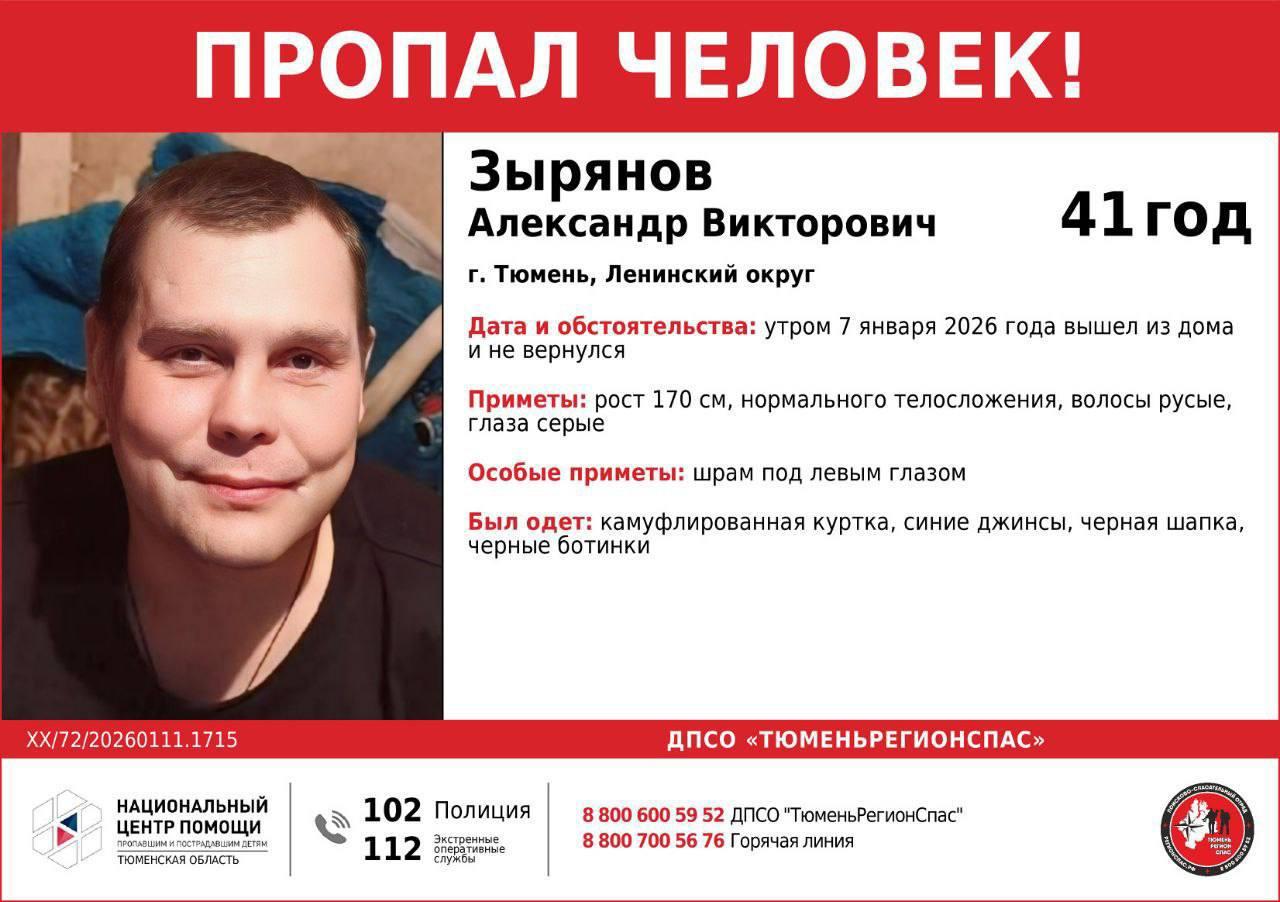 В Тюмени продолжаются поиски Александра Зырянова, пропавшего 7 января. Около часа дня он вышел из дома за сигаретами, но так и не вернулся. Последний раз его сожительница видела, как мужчина шёл по улице с незнакомцем. Обстоятельства исчезновения раскрыла сестра пропавшего Наталья.