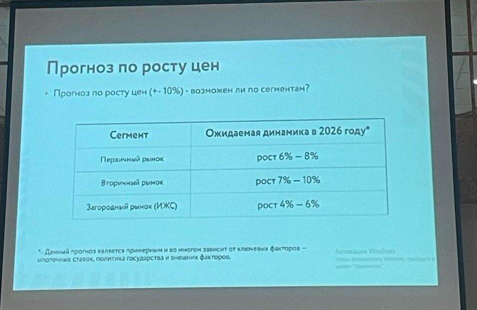 Во время выступления предприниматель представил слайд с ориентировочными цифрами роста цен на 2026 год по разным сегментам: