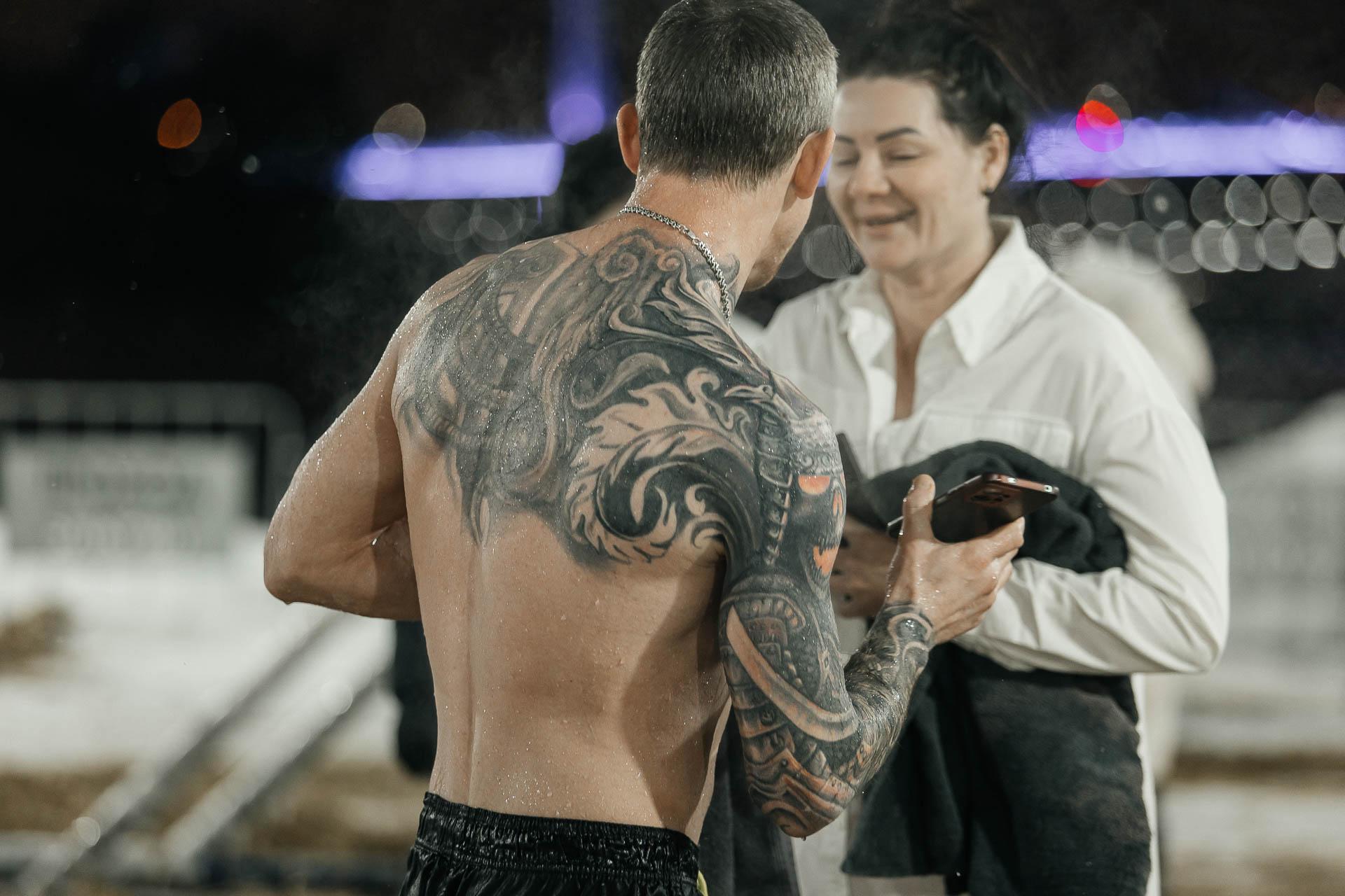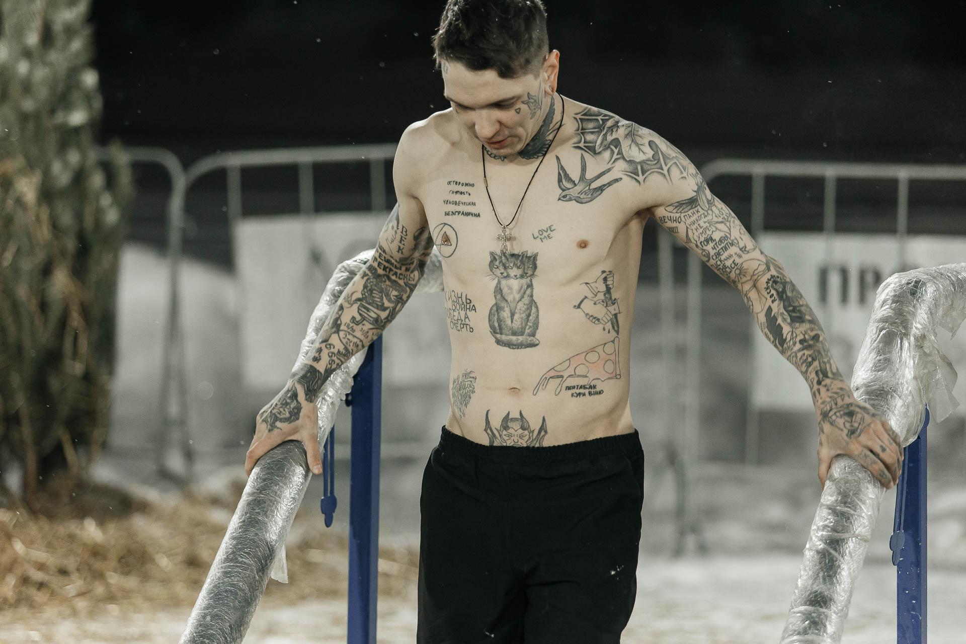 Участники крещенских омовений в Тюмени продемонстрировали разнообразные нательные рисунки, включая религиозные и светские надписи.