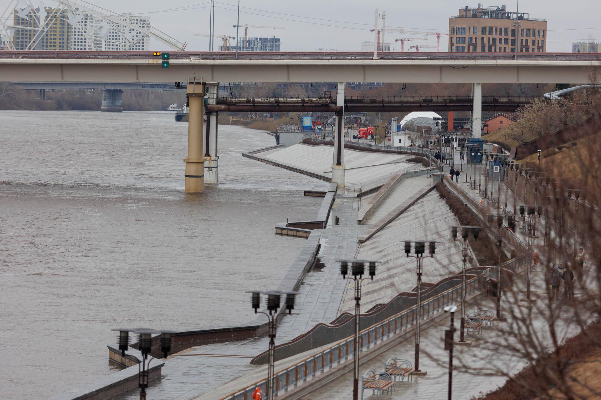 Уровень воды в реке Туре в Тюмени значительно повысился, что привело к затоплению первого яруса городской набережной.