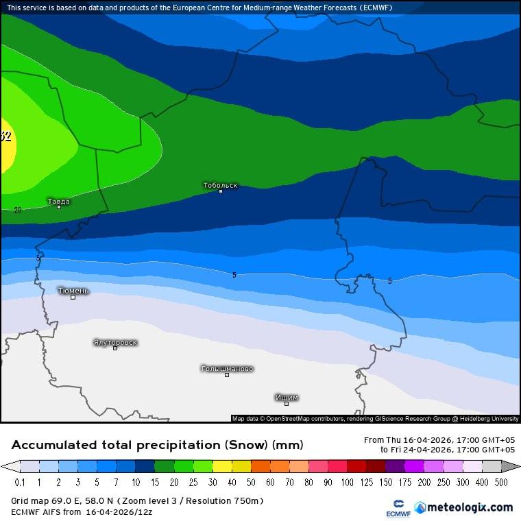 На визуализации показано количество осадков в виде снега, ожидаемое до 17:00 24 апреля. Согласно метеорологическому правилу, 1 мм осадков соответствует 1 см снежного покрова.