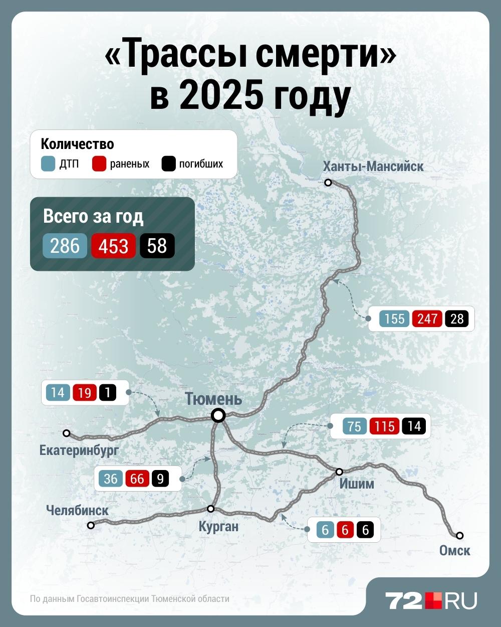 Наименьшее количество происшествий отмечено на направлениях Челябинск — Курган — Омск — Новосибирск, подъезде к Ишиму и трассе в сторону Екатеринбурга. Здесь случилось 6 и 14 ДТП соответственно. При этом на западной трассе погиб один человек, а на пути к Ишиму — шесть.