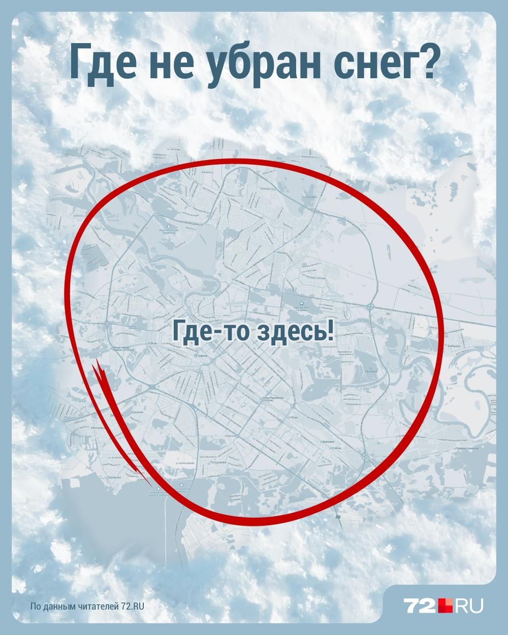 Карта, отображающая участки с неубранным снегом в Тюмени. Вопрос к читателям: очищены ли дворы и дороги в их районах?