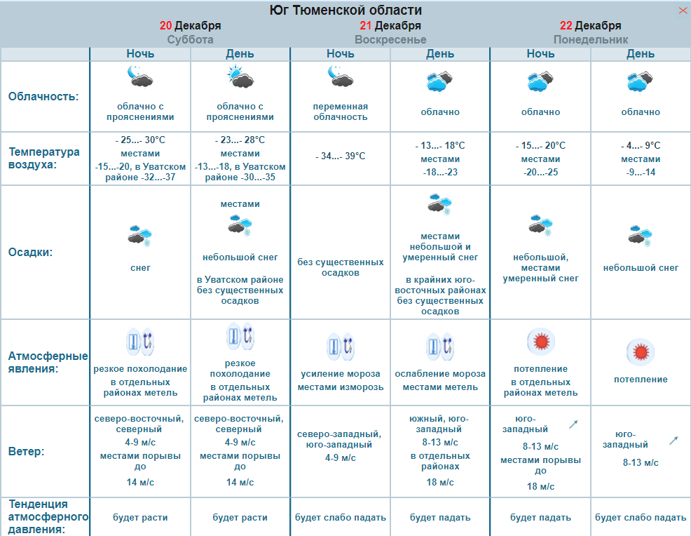 «Ночью и утром 21 декабря в Тюмени прогнозируется понижение температуры до −33…−35 градусов. 19 и 21 декабря пройдет снег, 21 декабря — с порывами ветра до 12 м/с. 22–23 декабря потеплеет до −2…−4 градусов, а 24–25 декабря вновь похолодает до −25…−30 градусов. В период с 28 по 30 декабря ожидается потепление», — рассказывает Винштейн.